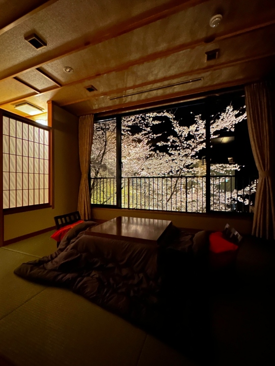 お部屋の電気を落として、ライトアップされた夜桜は